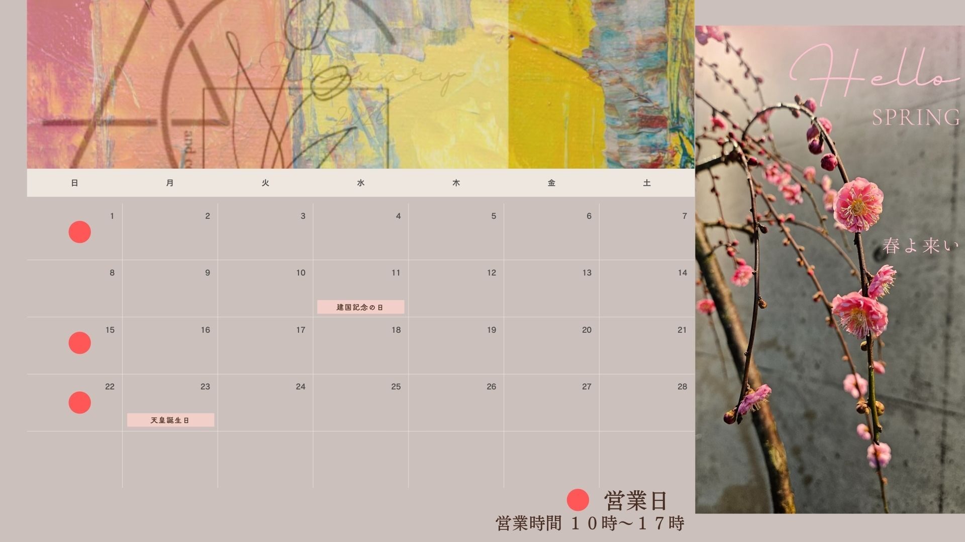 さて、本日からはいよいよ2月。 梅のつぼみも膨らみ始める季節ですね。2月の店舗営業カレンダーを公開いたします。